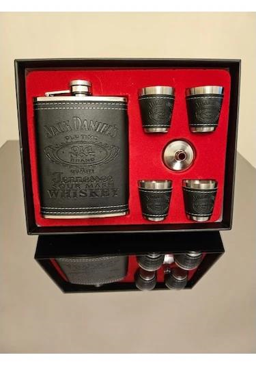 Paslanmaz Çelik 4 Shot Bardaklı Deri Kaplama Matara Seti 306-10